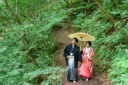黒紋付と白無垢に身を包んだおふたり。和傘を差して桜並木を歩きます。
