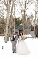 おふたりのシルエットが綺麗ですね。奥に見える天然の木々や苔庭とのコントラストが素敵です。