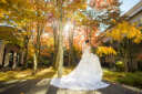 一面に紅葉がひろがるなか抱き寄せ合って新婚らしいお写真を撮影。