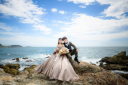 ウェディングドレス姿で撮影スタート!海を臨むチャペルでの1枚。