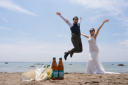 白い波が足元まで届く砂浜を、ゆったりと歩むふたりの姿が海とひとつに溶け込みます。