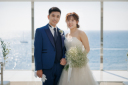 大きな窓越しに広がる青い海。静かに寄り添うふたりの姿は、自然と調和した特別な一枚として永遠に輝きます。