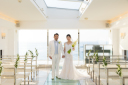 砂浜のバージンロードに立ってポーズ。天窓から差し込む陽光がおふたりを照らします。