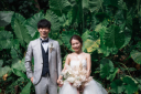 青い海と白い砂浜にはビビッドな色のブーケを選びがちですが、このようなホワイトのブーケもとてもお似合いになります。