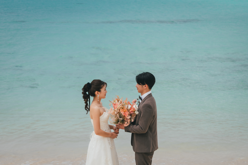青空ビーチをバックに撮影する人気No.1プラン♪ 撮影・衣裳・ご新婦ヘアメイクなどの通常プランを早割でお得にご案内!