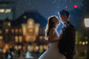お二人を縁取る光とロゴの淡い光が融け合って、まるでおふたりのための文字のように