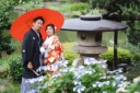 花畑記念庭園は橋や滝、池や東屋・茅葺の門など色々なシーンで撮影が可能です。東屋での1枚