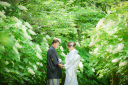 アジサイをバックに新婦様のソロショットです♡赤い番傘も映えます♪