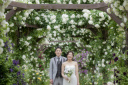 色鮮やかなフラワーの背景に仲良く手繋ぎショット♡笑い合うお二人の笑顔がとっても素敵です!