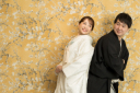 白無垢に象牙色の色掛下とモダン柄の刺繍衿を併せたとってもお洒落な和装コーデで仲良く寄り添いショット♡