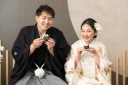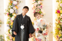 まずは定番の立ちのショットご新婦様の可愛らしい雰囲気に白無垢が合いますねご新郎様も黒の紋服が大変お似合いです