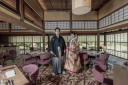 旧高宮貝島家住宅の赤い絨毯の上でのお写真で和の風情を感じさせ高宮庭園茶寮らしさを表現しました。