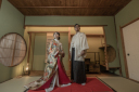 建物一つ一つがお二人によって素敵な写真スポットとなりました。柱にもたれかかる新郎様。木造の建物に囲まれているお姿はタキシードのかっこよさが際立っております。