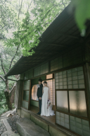 高宮庭園茶寮らしいお写真の1つ、茶房での1枚。笑顔で見つめ合うお二人は、今後の未来への希望に満ちていますね。