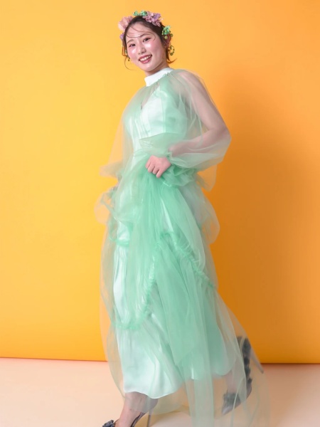 ふわふわのお袖がロマンチックなカラードレス。甘々にならないのは爽やかなお色のおかげ♪カジュアルに着こなせるカラードレスです!