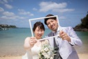 ワンちゃんと1ショット。かりゆしビーチではワンちゃんと一緒に撮影も可能。
