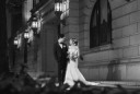 すっかり夜の東京駅。立ち姿が様になるおふたり。立ち並ぶビルの夜景が写真を彩ります。