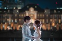 東京駅の駅舎前にて。見つめあうお二人がロマンチックです。駅舎のライトが海外みたいで映画のワンシーンのようです!