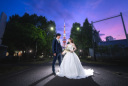 ご新婦様にのみ視線をいただきご新婦様にフォーカスした構図でお撮りしました街灯にピントを合わせないことで光の割合が大きくなってドラマチックなお写真に仕上がります