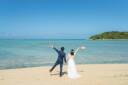 砂浜に腰をかけカメラ目線のおふたり 真正面には美しいビーチが