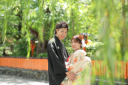 到着して早速!新緑とお空をバックに。門前で画角の広いお写真ですが、お2人が見つめ合っている姿が素敵です*
