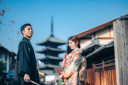 古都京都の街並みは古き良き日本建築立ち並ぶロケーションフォトにもピッタリな街。和装ともよく似合うこの東山で一枚