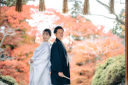 紅葉に染まった鮮やかな木々に包まれて季節の訪れを感じるおふたりの一枚を