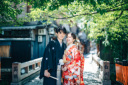 青空と五重塔を背景にお二人ともブーケに視線を移しております。オシャレなお写真になっており、一花写真館のお色味でより雰囲気を出すことができております。