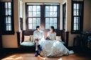 まるでフィルムのような窓の前に立つお二人は映画のワンシーンを切り取ったようなお写真に。