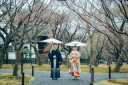 番傘での後ろ姿ショット。番傘での相合傘は、そこにお二人だけの空間が生まれ、印象的になります。