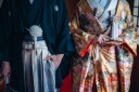 木の廊下でお正座ショット。綿帽子から見えるご新婦様の表情からはお二人の穏やかな空気感を感じますね。