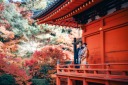 秋色に染まったイチョウを片手に、笑顔で顔を隠し合うおふたり。自然の美しさとおふたりの幸せな笑顔が輝く心温まる1枚。