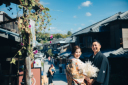 木々のオレンジと新婦様の色打掛のオレンジ。祇園の街並みが温かいオレンジ色に染まっています。