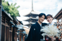 少し色づき始めた紅葉を眺めながら柔らかくナチュラルな表情に 朱色の本堂に純白のお着物がとっても映えています