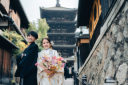 八坂の塔をバックに和傘を使い寄り添いショット。青空が京の町によく合いますね。