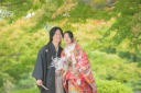 9月中頃の撮影となりました今回は和室ご利用ないため屋外での正座ショット、まだまだ緑の綺麗でお選びいただいた着物も映えます