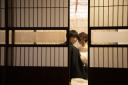 夕暮れの雰囲気漂う縁側で寄り添い合う後ろ姿の1ショット。