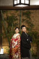 柔らかな光に包まれ横向きで佇むおふたりのシルエットが美しく浮かび上がります。着物ならではの流れるラインと二人の距離感が、静かでありながら幻想的な一枚になります。