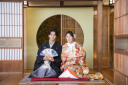 和装で正座のご挨拶ショットは、みなさまが必ず撮りたいショットではないでしょうか。古民家スタジオならではの、丸窓の奥にはお庭が見える「和」の雰囲気全開のショット!