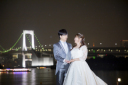 甲板にでて東京の臨海地域を背景におふたりを撮影。船上ならではの壮大なパノラマビューに写るお二人!ステキです♪