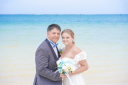 広大な海と空を背景に、穏やかに視線を交わす新郎新婦。自然の美しさに包まれた、永遠を誓う瞬間。