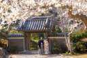 「御門(ごもん)」前にて。三渓園では定番の撮影スポットになります!