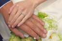 生花のブーケを手に取りあいながらのバックハグショットです。