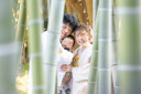 笑顔で額を合わせるお二人。竹林での撮影からの一枚です。