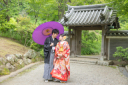 小さな門と緑を背景に番傘を使用したツーショットです♪