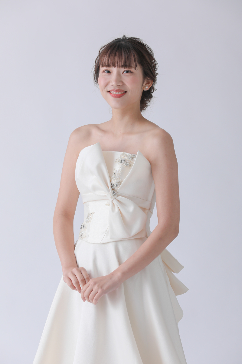 胸元のリボンがアクセントになっているドレス。トレーンはチュール素材で角度によって印象が変わります。