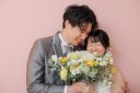 ぎゅっと寄り添うおふたり。お手元にはおふたりを結ぶ赤い寿の文字が!