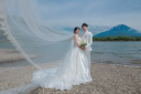 夕暮れ時の海は黄金色の海。寄り添うおふたりが素敵です。