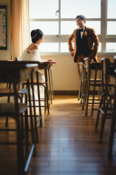 木目調の背景を生かし、表情もクールに大人っぽく。たくさんのバリエーションを残せるのも魅力ですよね!