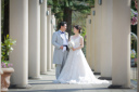 桜舞う小道をおふたりでお散歩。後ろ姿も素敵ですね。